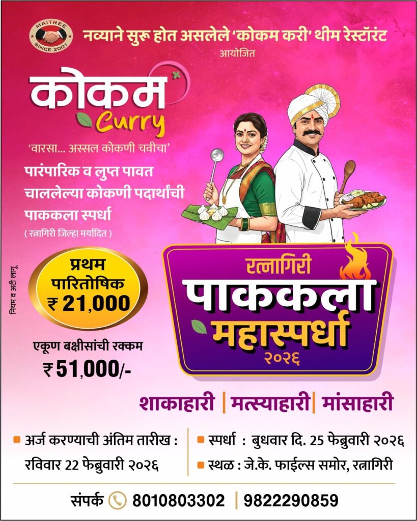रत्नागिरी, ता. 16 : जिल्ह्यातील गृहिणी व पाककला प्रेमींसाठी एक सुवर्णसंधी उपलब्ध झाली आहे. रत्नागिरीत नव्याने सुरू होत असलेल्या ‘कोकम करी’ या थीम रेस्टॉरंटच्या वतीने रत्नागिरी पाककला महास्पर्धा २०२६ चे आयोजन करण्यात आले आहे. पारंपारिक तसेच लुप्त होत चाललेल्या अस्सल कोकणी पदार्थांना व्यासपीठ मिळावे, या उद्देशाने ही भव्य स्पर्धा आयोजित करण्यात येत आहे. स्पर्धेसाठी अर्ज करण्याची अंतिम तारीख २२ फेब्रुवारी २०२६ दुपारी १२ वाजेपर्यंत असून प्रत्यक्ष स्पर्धा बुधवार, २५ फेब्रुवारी २०२६ रोजी होणार आहे. स्पर्धेचे स्थळ एलजी शोरूम शेजारी, जे. के. फाइल्स, रत्नागिरी येथे निश्चित करण्यात आले आहे. Cooking competition in Ratnagiri