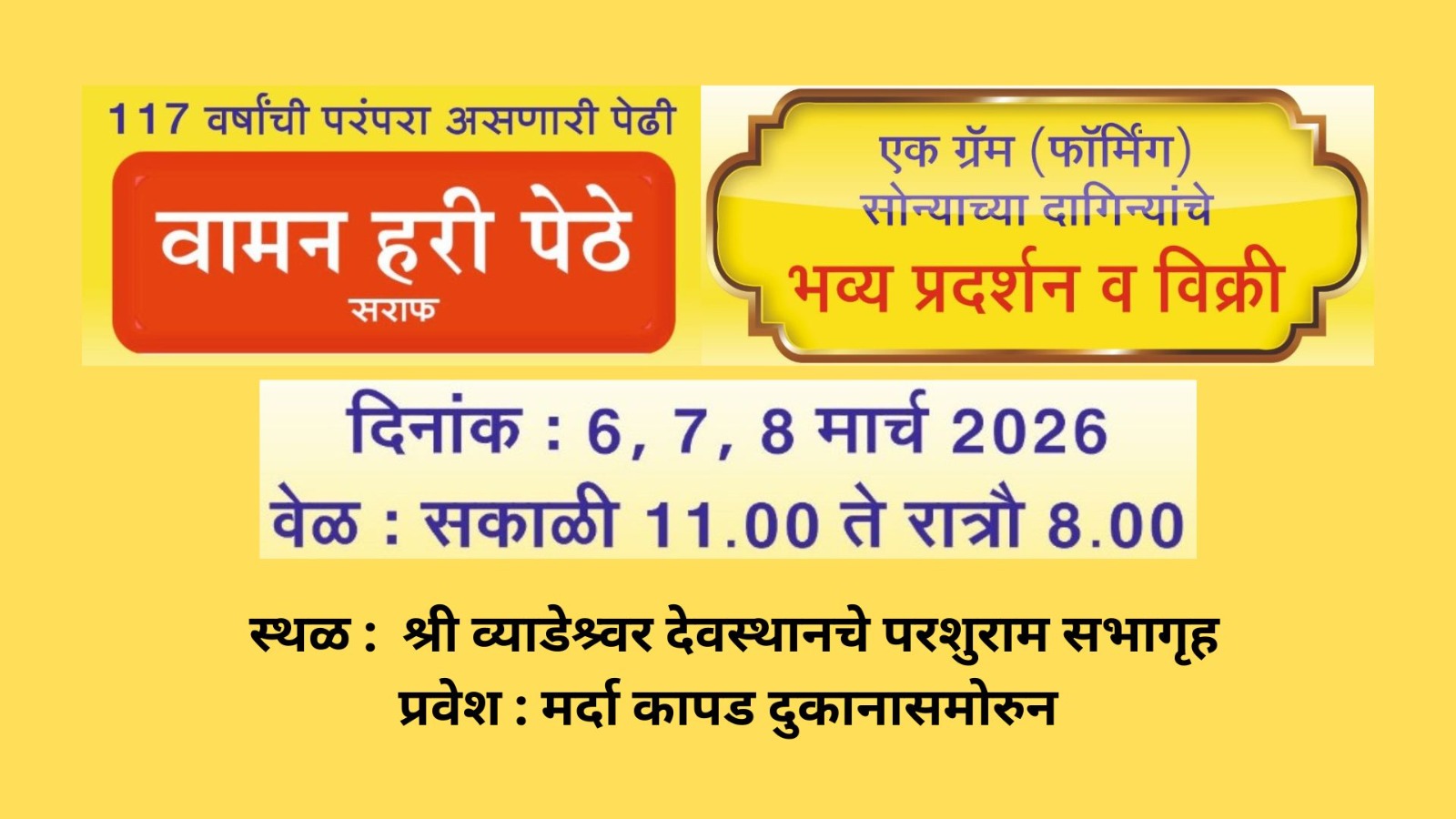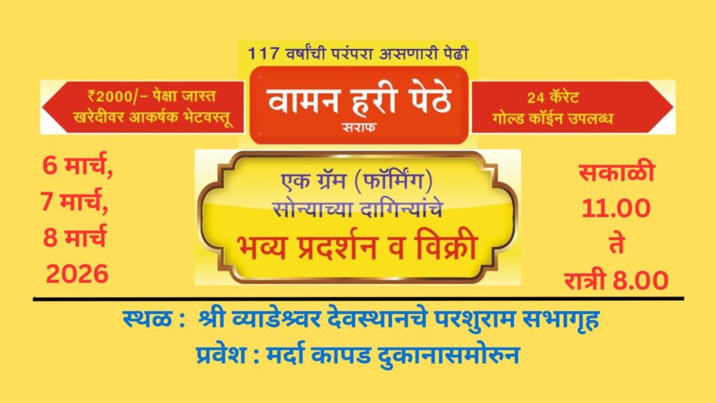 गेल्यावर्षी गुहागरमध्ये वामन हरी पेठे सराफ (WHP Saraf) या पेढीतर्फे आयोजित केलेल्या प्रदर्शन व विक्रीला ग्राहकांनी उत्स्फूर्त प्रतिसाद दिला. कमी दरात आकर्षक दिसणारे दागिने घेण्यासाठी सर्व स्तरातील महिलांची गर्दी झाली. या प्रतिसादामुळेच वर्षभराने पुन्हा एकदा वामन हरी पेठे सराफ या पेढीतर्फे गुहागरमध्ये प्रदर्शन व विक्री करण्यात येणार आहे. 6, 7, 8 मार्च 2026 असे तिन दिवस, सकाळी 11 ते रात्री 8 या कालावधीत गुहागरमधील व्याडेश्र्वर देवस्थानच्या परशुराम सभागृहात 1 ग्रॅम सोन्याचे (फॉर्मिग) दागिन्यांचे प्रदर्शन आयोजित करण्यात आले आहे. यामध्ये बांगड्या, पाटल्या, अनारकली तोडे, इयर रिंग्ज्, पिचोडी, गजरा ठुशी, गंठण, बोर माळ, राणीहार, मोहन माळ, बकुळ हार, पोहे हार असे विविध प्रकारचे दागिने पहाण्याबरोबरच विक्रीसाठी उपलब्ध आहेत. Exhibition of WHP Saraf in Guhagar