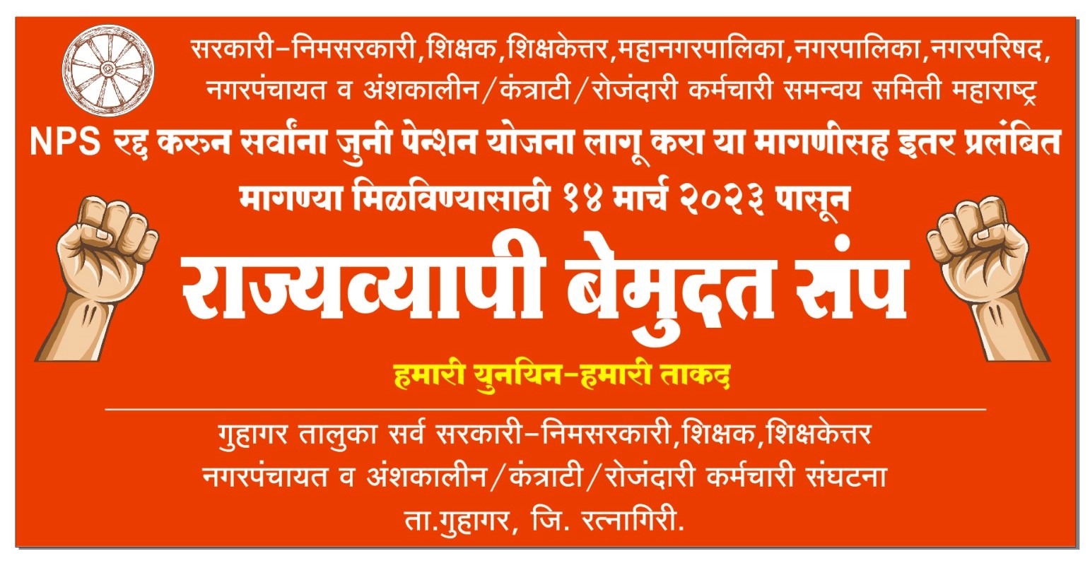 एनपीएस योजना रद्द करुन सर्वांना जुनी पेन्शन योजना लागू करावी. या मागणीसाठी राज्य सरकारबरोबर गेली दोन वर्ष चर्चा सुरु आहे. मात्र या चर्चेतून सकारात्मक निर्णय झाला नाही. त्यामुळे शासकीय, निमशासकीय, शिक्षक, शिक्षकेतर, महानगरपालिका, नगरपालिका, नगरपरिषद, नगरपंचायत व अंशकालीन कंत्राटी रोजंदारी कर्मचारी समन्वय समिती  महाराष्ट्र राज्य तर्फे 14 मार्चपासून बेमुदत संपाची हाक देण्यात आली. या निर्णयाच्या पार्श्र्वभुमीवर सोमवारी (13 मार्चला) सायंकाळी शासकीय विश्रामगृह, गुहागर येथे तालुक्यातील विविध संघटनांच्या पदाधिकाऱ्यांची बैठक झाली. या बैठकीमध्ये महाराष्ट्र राज्याच्या समन्वय समितीच्या बेमुदत संपाला 100 टक्के पाठींबा देण्याचा निर्णय घेण्यात आला. त्याचप्रमाणे मंगळवारी, 14 मार्चला तालुक्यातील सर्व कर्मचाऱ्यांचा मोर्चा काढण्याचे ठरविण्यात आले. हा मोर्चा मंगळवारी, 14 मार्चला सकाळी 10.30 वा. पंचायत समिती गुहागरमधुन सुरु होईल. मोर्चाच्या सुरवातीला गटविकास अधिकारी, गुहागर यांना निवेदन दिले जाईल. मोर्चेकऱ्यांसमोर काही संघटनांचे पदाधिकारी संपाची आवश्यकता, आधी झालेले प्रयत्न याबाबत मनोगत व्यक्त करतील. त्यानंतर पंचायत समिती पासून मोर्चाची सुरुवात होईल. तहसिलदार कार्यालय गुहागर  येथे मोर्चा आल्यावर तहसीलदारांना निवेदन दिले जाईल. त्याच ठिकाणी मोर्च्याची सांगता होणार आहे. Govt. Employees On Strike
