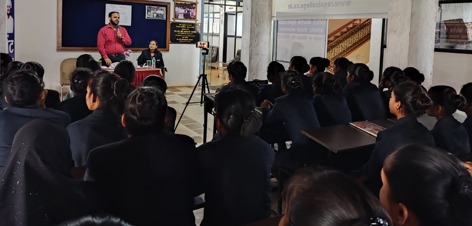या व्याख्यानामध्ये सर्व प्रथम रिगल कॉलेज शृंगारतळी च्या प्राचार्या सौ.रेश्मा मोरे यांनी उपस्थित पाहुण्यांचे पुष्पगुच्छ देऊन स्वागत केले. तसेच हॉटेल मॅनेजमेंट विभाग प्रमुख प्रा.शैलेश घाणेकर यांनी पुष्पगुच्छ आणि सन्मानचिन्ह देऊन पाहुण्यांचे स्वागत व सत्कार केला. श्री.डॉ.सचिन ओक यांनी सांगितले की, विद्यार्थिनिंनी नेहमी सुयोग्य दिनचर्येतून निरोगी शैली आत्मसात करावी. त्यात वेळेवर जेवणे, पुरेशी झोप, प्रथिनयुक्त आहार, शारीरिक स्वच्छता याचे महत्व पटवून दिले. नर्सिंग केअर या सदरामध्ये नर्सेसना नर्सिंग क्षेत्रासंर्भात नेहमी मुलभूत ज्ञानाच्या माहितीबरोबरच गरूकता, चपळपणा, समयसूचकता, प्रामाणिकपणा या गोष्टी असणे आवश्यक आहे. या गोष्टींच्या सहाय्याने नर्स जगामध्ये कुठेही काम करू शकते. चांगल्या नर्सस मुळेच हॉस्पिटलचा दर्जा उंचावतो असेही ते म्हणाले . रिगल कॉलेज शृंगारतळीमध्ये नर्सिंग हा कोर्स असणे हे भाग्याचे आहे. या संधीचा लाभ सर्व विद्यार्थीनिंनी घ्यावे असे सांगितले व रिगल कॉलेजला नेहमी मी सहकार्य करेन, अशी ग्वाही दिली. Guidance on “Nursing and Women’s Health”