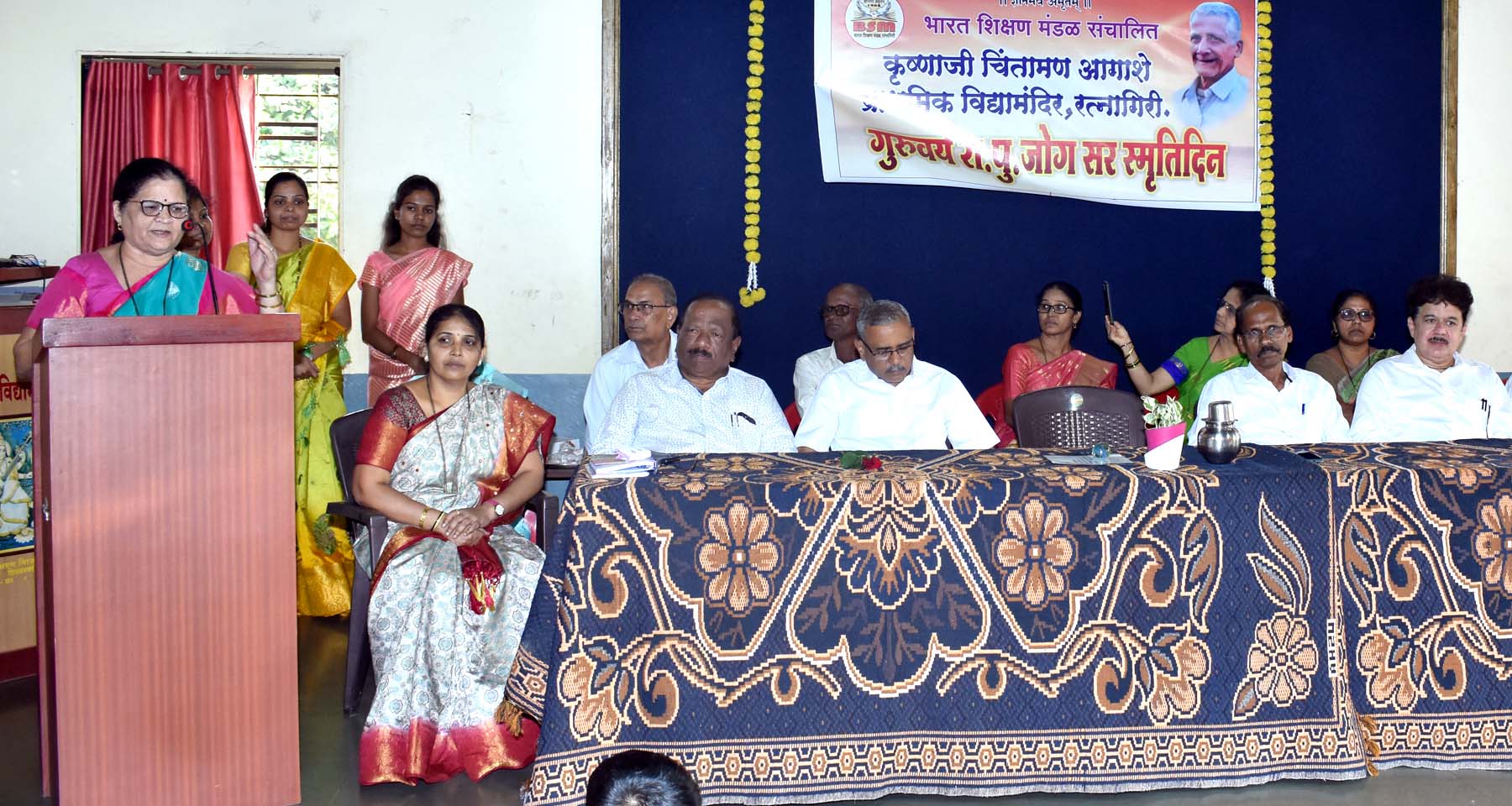 रत्नागिरी, ता. 22 : प्राथमिक शाळा हा विद्यार्थ्यांच्या उभारणीचा टप्पा आहे. त्यामुळे मुलांना रागावू नका, मुलं म्हणजे देवाघरची फुलं. विद्यार्थी हा शाळेचा खरा दागिना आहे. त्यांना गोड भाषेत समजावून सांगा. काम असं करावं की लोकांनी आपल्याकडे आले पाहिजे, असे मार्गदर्शन कै. गुरुवर्य रामचंद्र जोग करायचे. त्यांच्या मार्गदर्शनातून कृ. चिं. आगाशे विद्यामंदिरची ( Agashe Vidyamandir ) वाटचाल सुरू आहे, असे प्रतिपादन निवृत्त मुख्याध्यापिका शीतल काळे यांनी केले. आगाशे विद्यामंदिरात गुरुवर्य जोग स्मृती कार्यक्रमात त्या बोलत होत्या.  Guruvarya Jog Memorial Day at Agashe Vidyamandir