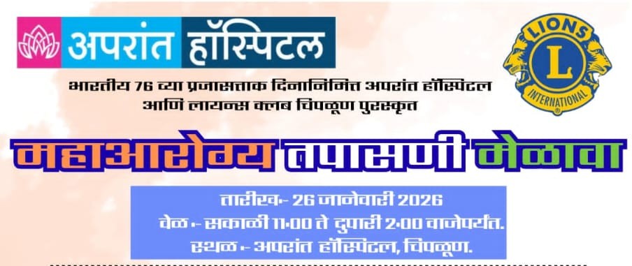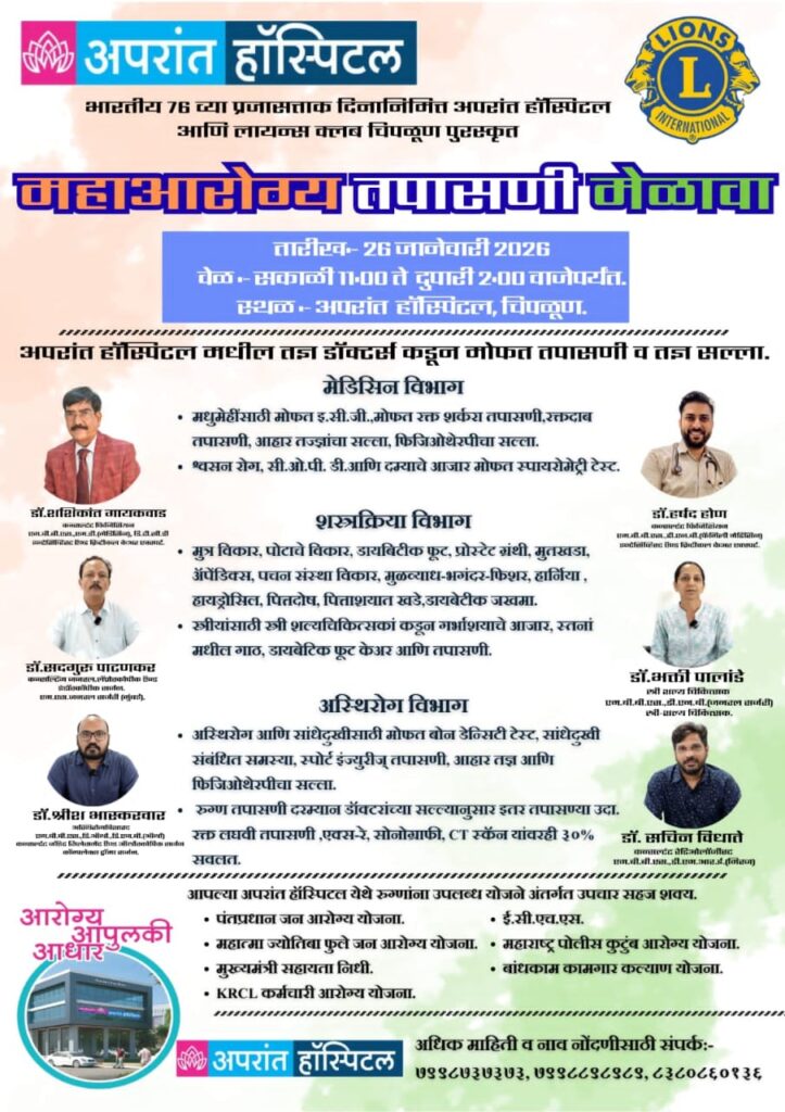 गुहागर, ता. 23 : प्रजासत्ताक दिनानिमित्त अपरांत मल्टीस्पेशालिटी हॉस्पिटल, चिपळूण येथे दि. २६ जानेवारी २०२६ रोजी मेडिसिन, ऑर्थोपेडिक व जनरल सर्जरी विभागांचे एकत्रित भव्य महाआरोग्य तपासणी शिबिराचे आयोजन करण्यात आले आहे. हे शिबिर सकाळी दहा ते दोन या वेळेमध्ये पार पडणार आहे. Health camp at Aparant Hospital