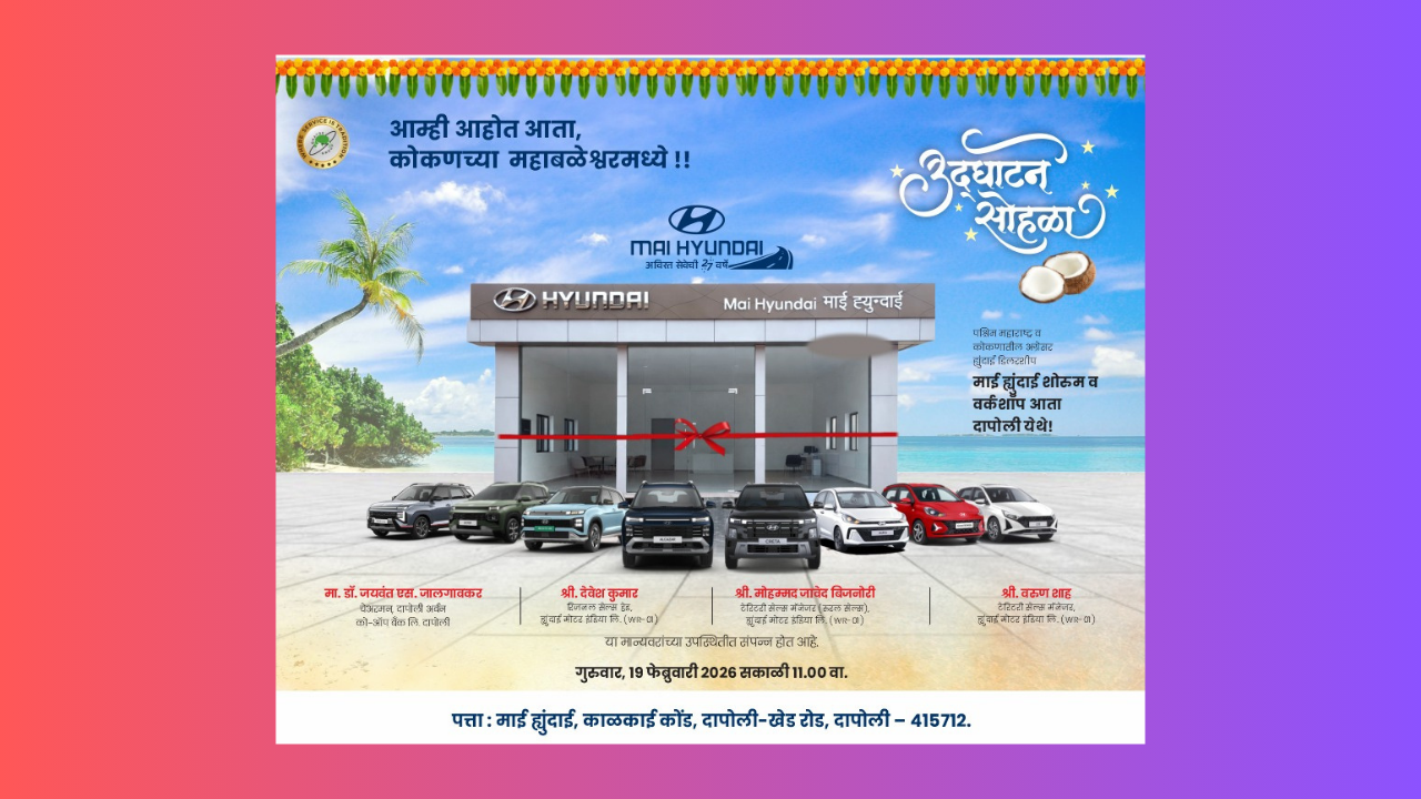 गुहागर, ता. 18 : कोकण व पश्चिम महाराष्ट्रातील ह्युंदाई मोटरचे प्रमुख ऑटोमोबाइल डीलर माई ह्युंदाईने कोकण भागातील ग्राहकांसाठी आणखी एक महत्त्वपूर्ण पाऊल उचलले आहे. कंपनीच्या २७ वर्षांच्या अखंडित सेवेच्या पार्श्वभूमीवर दापोली येथे नवीन शोरूमचे उद्घाटन गुरुवार दिनांक १९ फेब्रुवारी २०२६ रोजी सकाळी ११.०० वाजता संपन्न होणार आहे. Inauguration of Mai Hyundai’s new showroom
