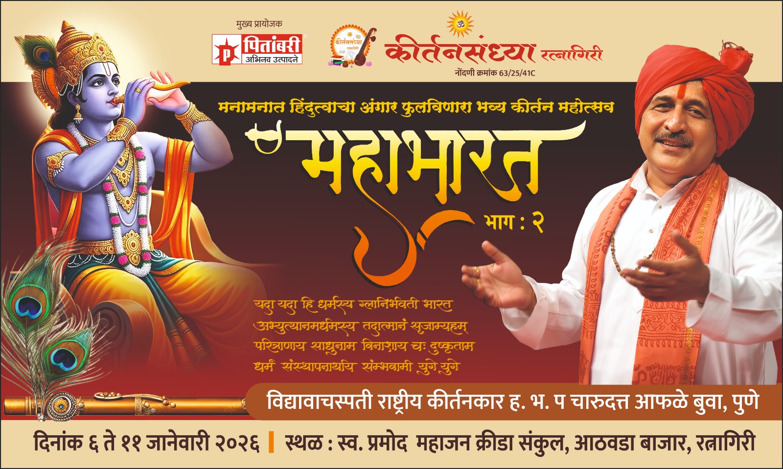 यावर्षी ६ ते ११ जानेवारी २०२६ या कालावधीत दररोज सायंकाळी ६ ते रात्री १० या वेळेत हा महोत्सव रत्नागिरीच्या स्व. प्रमोद महाजन क्रीडासंकुल होणार आहे. नीटनेटके आयोजन, प्रशस्त बैठक व्यवस्था असणारा कीर्तनसंध्या महोत्सव असून महोत्सवात नेहमीप्रमाणेच सर्व व्यवस्था असणार आहे. कीर्तन महोत्सवाचे मुख्य प्रायोजकत्व पितांबरी उद्योग समूहाने स्वीकारले आहे. Kirtankar will reveal aspects of Mahabharata
