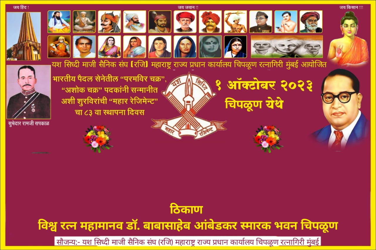 रत्नागिरी, ता. 29 : डॉ बाबासाहेब आंबेडकर यांच्या अथक प्रयत्नाने स्थापन झालेल्या भारतीय भूदल सेनेतील परमवीर चक्र, अशोक चक्र, वीर चक्र आदी अनेक विविधांगी शौर्य पदकांनी  सन्मानित झालेल्या शूर, पराक्रमी योद्धांच्या महार रेजिमेंटचा  ८३ व्या स्थापना दिना(रेजिंग डे) चे आयोजन करण्यात आले आहे. रविवार, दि. ०१ ऑक्टोबर २०२३ रोजी स. ९.०० वाजता महामानव डॉ बाबासाहेब आंबेडकर स्मारक भवन, प्रांत कार्यालय जवळ, चिपळूण येथे यश सिद्धी माजी सैनिक संघ (रजि‌.) महाराष्ट्र राज्य, प्रधान कार्यालय, चिपळूण येथे संघटनेच्या आजी माजी सैनिक, कुटुंब परिवार आणि मान्यवरांच्या उपस्थितीत आयोजन करण्यात आले आहे. Mahar Regiment Foundation Day at Chiplun