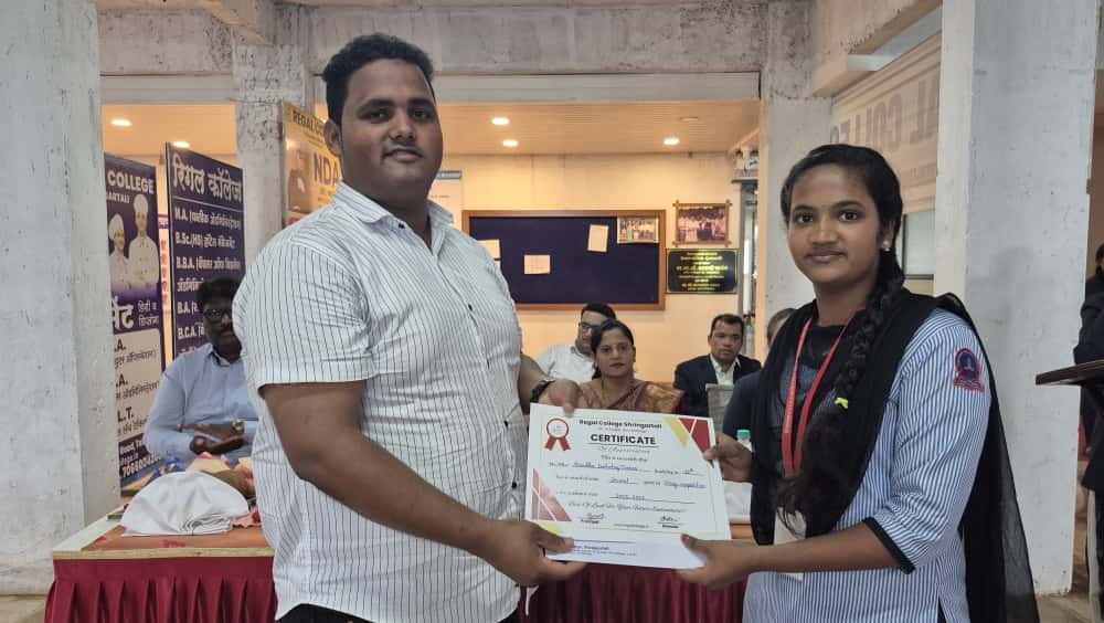 यावेळी प्रमुख पाहुणे म्हणून सौ.वैष्णवी नेटके(सरपंच,ग्रामपंचायत, आबलोली), श्री. आसिम साल्हे(उपसरपंच,ग्रामपंचायत, पाटपन्हाळे), .एस.आर.कदम(उपमुख्याध्यापक,सरस्वती विद्यामंदिर, जामसूत)उपस्थित होते.कार्यक्रमामध्ये प्रथम उपस्थित मान्यवरांचे शाल, श्रीफळ आणि सन्मानचिन्ह देऊन स्वागत आणि सत्कार करण्यात आला. आपल्या प्रास्ताविकेमध्ये रिगल कॉलेज, शृंगारतळीच्या प्राचार्या सौ. मोरे मॅडम यांनी विद्यार्थ्यांचे अवांतर वाचन व्हावे तसेच विविध विषयांच्या संकल्पनेचे आकलन व्हावे या उद्देशाने या स्पर्धेचे आयोजन करण्यात आले होते असे सांगितले.या स्पर्धेसाठी शाळा व शाळेतील मुख्याध्यापकांनी घेतलेल्या मेहनतीबद्दल त्यांनी आभार व्यक्त केले. Prize Ceremony at Regal College