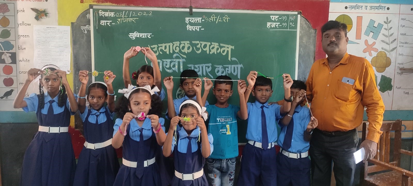 या शाळेत इयत्ता पहिली ते चौथीच्या विद्यार्थ्यांनी उपशिक्षिका श्रीमती रेणुका उपाध्याय, मुख्याध्यापक श्रीमती स्मिता सावंत, उपशिक्षक श्री. दिनेश डोरलेकर यांच्या मार्गदर्शनाखाली उत्पादक उपक्रमांतर्गत विविध प्रकारच्या राख्या तयार केल्या. लो, मणी, पेन्सिल, जुने पेन इत्यादी साहित्य वापरून वेगवेगळ्या डिझाईन मध्ये राख्या तयार केल्या. स्वनिर्मितीतून तयार करण्यात आलेल्या राख्यांबाबत विद्यार्थ्यांना वेगळाच आनंद होत होता. राख्या तयार झाल्यानंतर इयत्तावार मुलगे व मुली यांचे गट करून रक्षाबंधन कार्यक्रम मोठ्या उत्साहात पार पडला. छोट्या मुलांचा आपल्या भावाला आरती ओवाळून हातात राखी बांधण्याचा अनुभव काही वेगळाच होता. यावेळी शाळा व्यवस्थापन समिती अध्यक्ष, उपाध्यक्ष, ग्रामपंचायत सदस्य, शिक्षणप्रेमी व सर्व सदस्य उपस्थित होते. Raksha Bandhan Program at Caravanchiwadi School